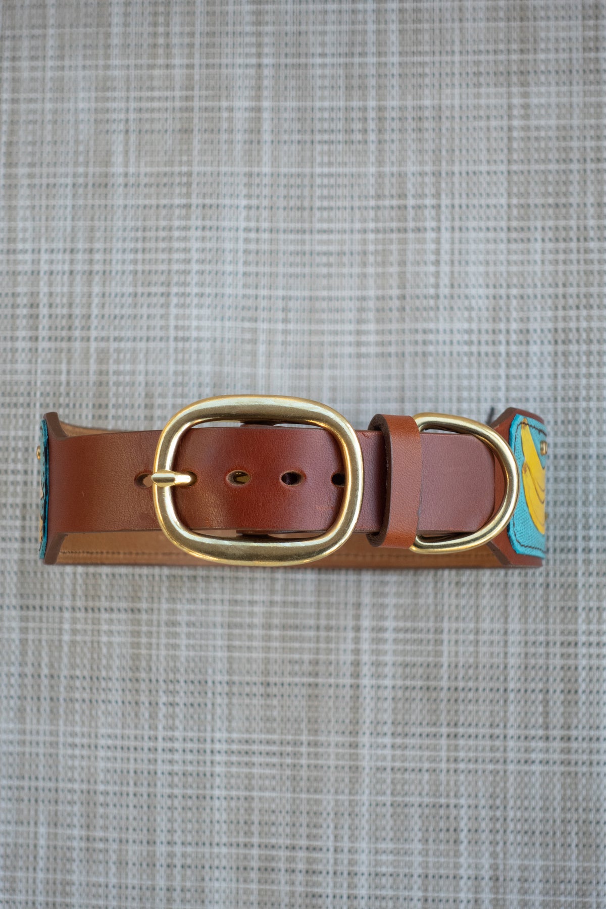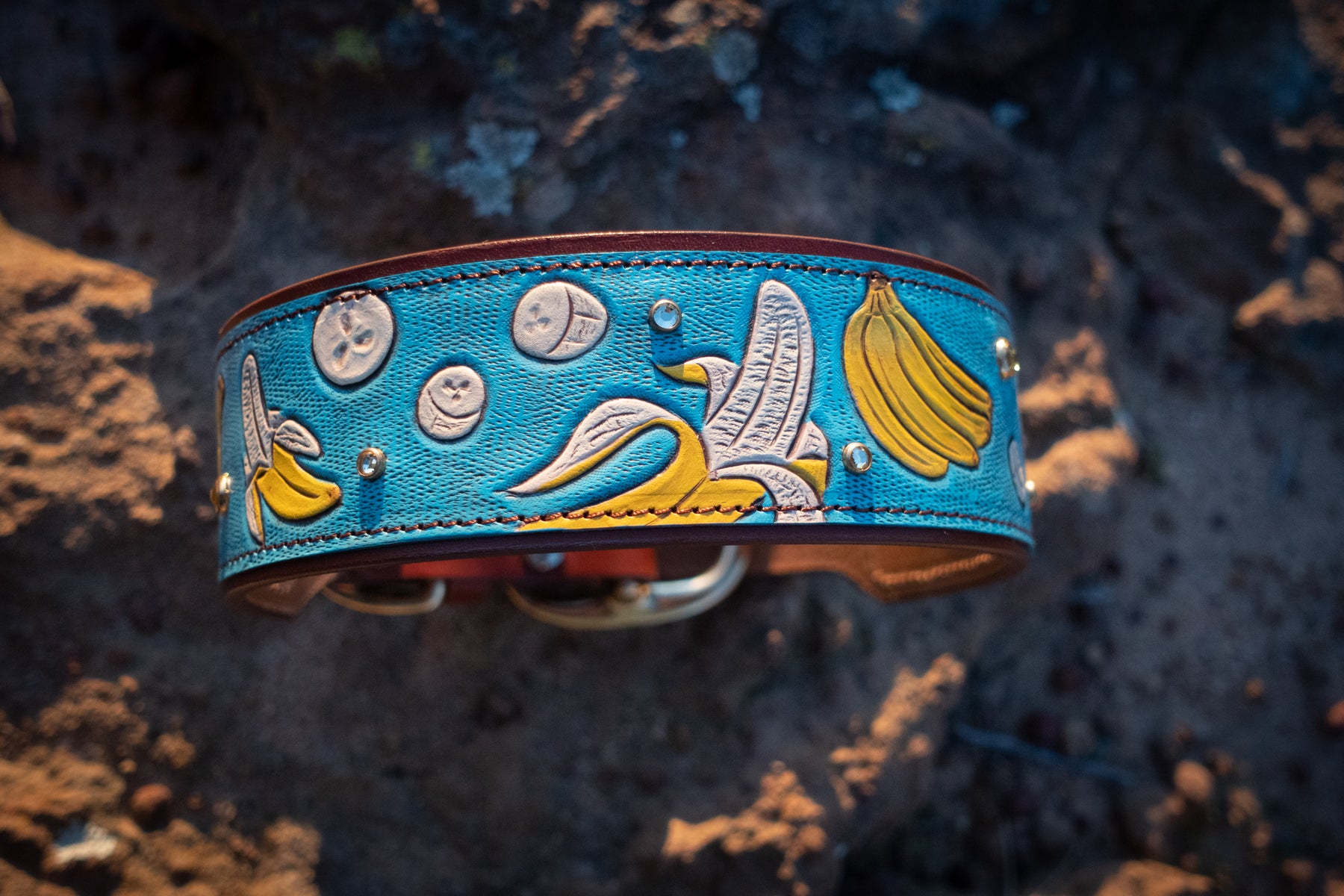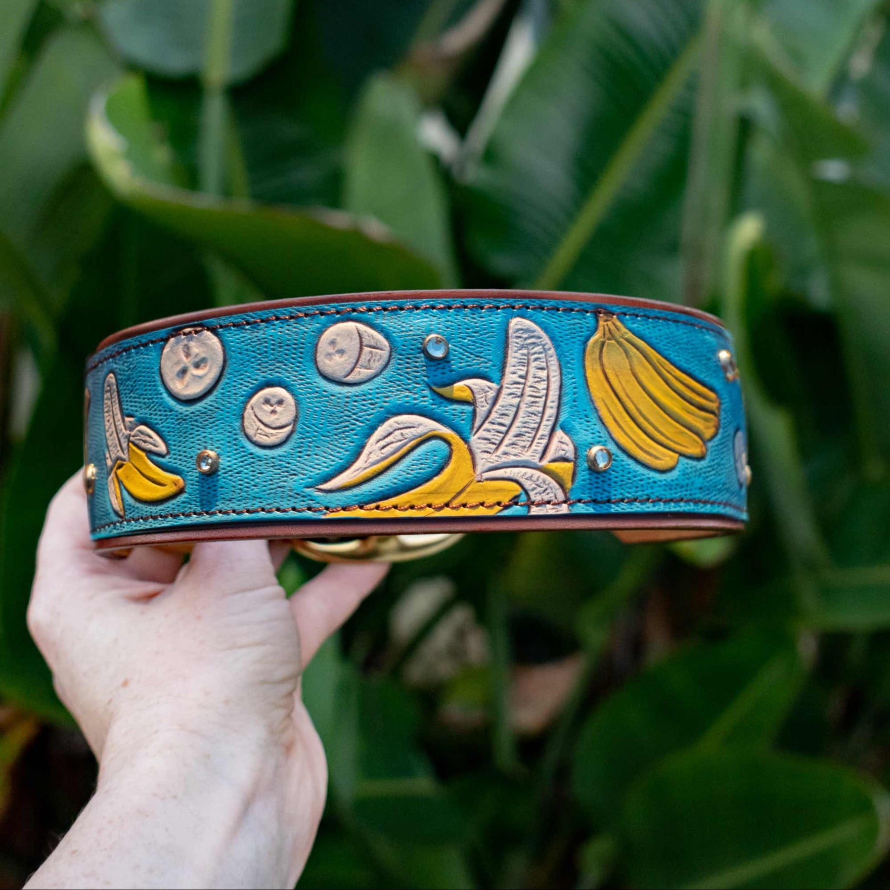 We use solid brass and nickel-plated solid brass hardware for our collars. These center-bar buckles and D-rings are tested for strength and durability. We use chicago screws with Loctite permanent rivet glue to ensure our collars are as durable and strong as they are beautiful. The safety and comfort of your dog is our top priority!