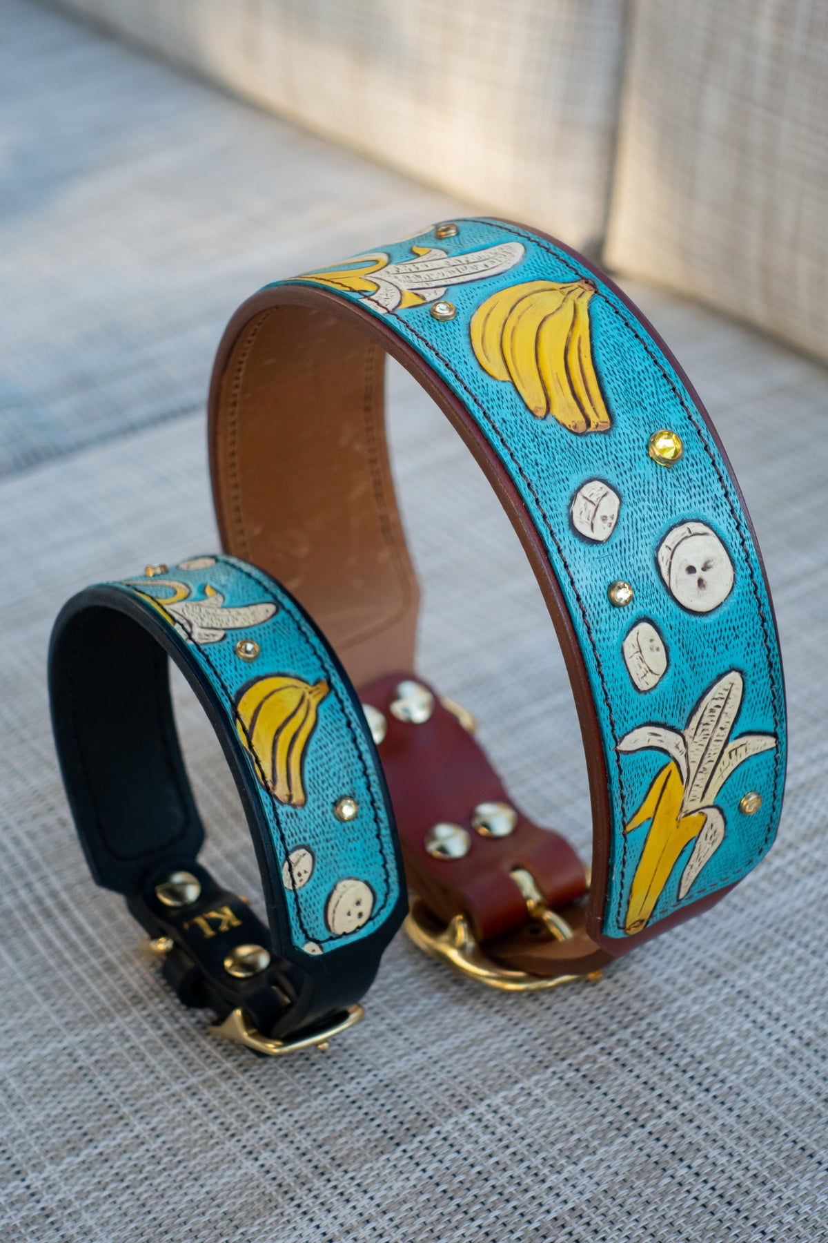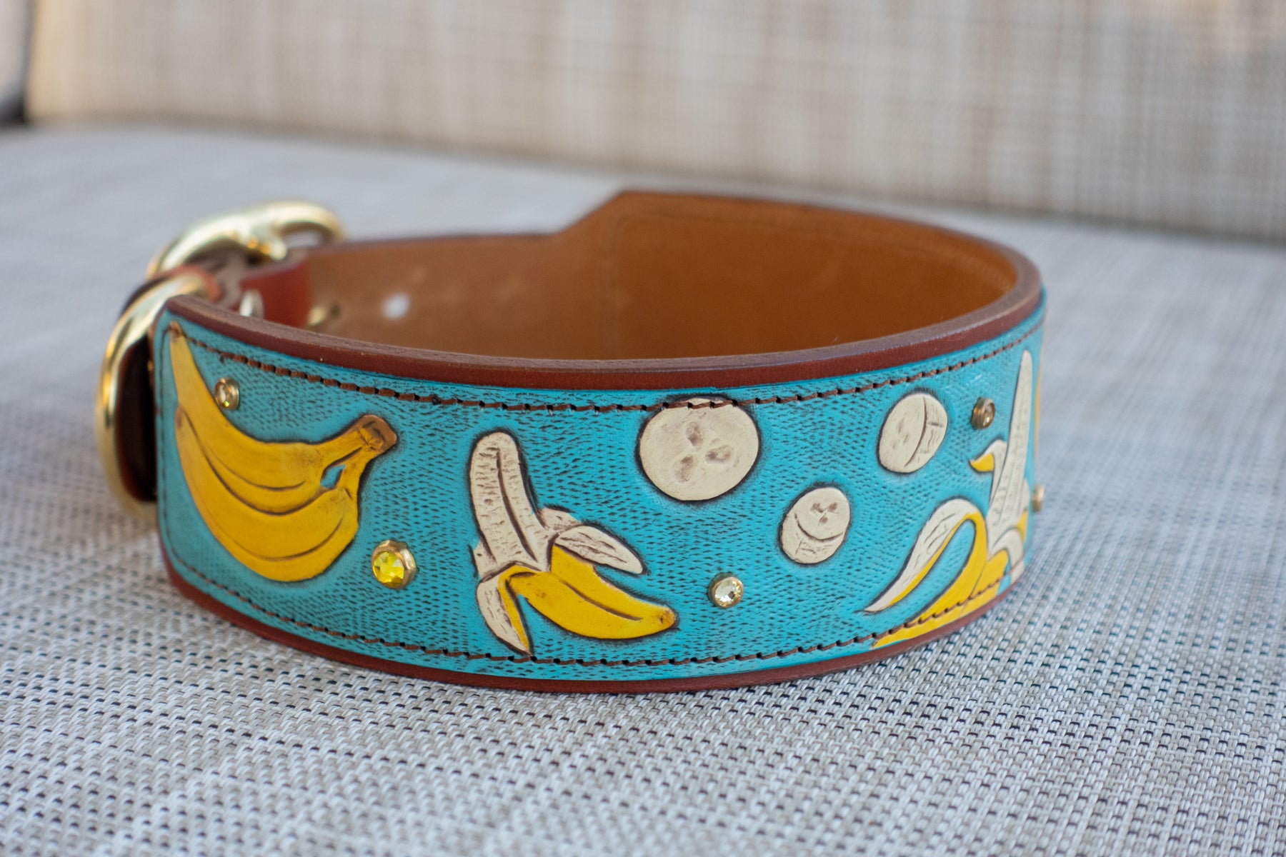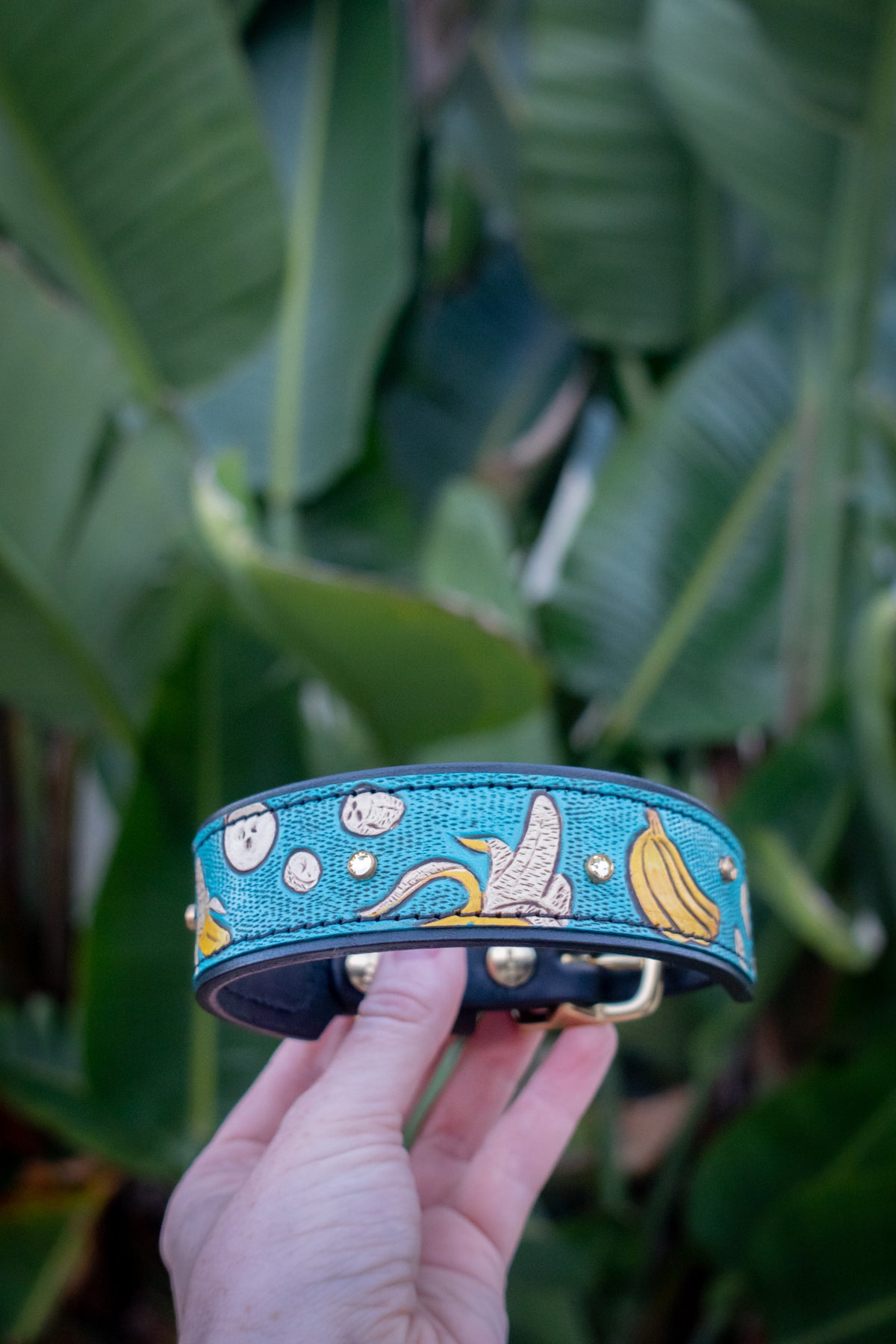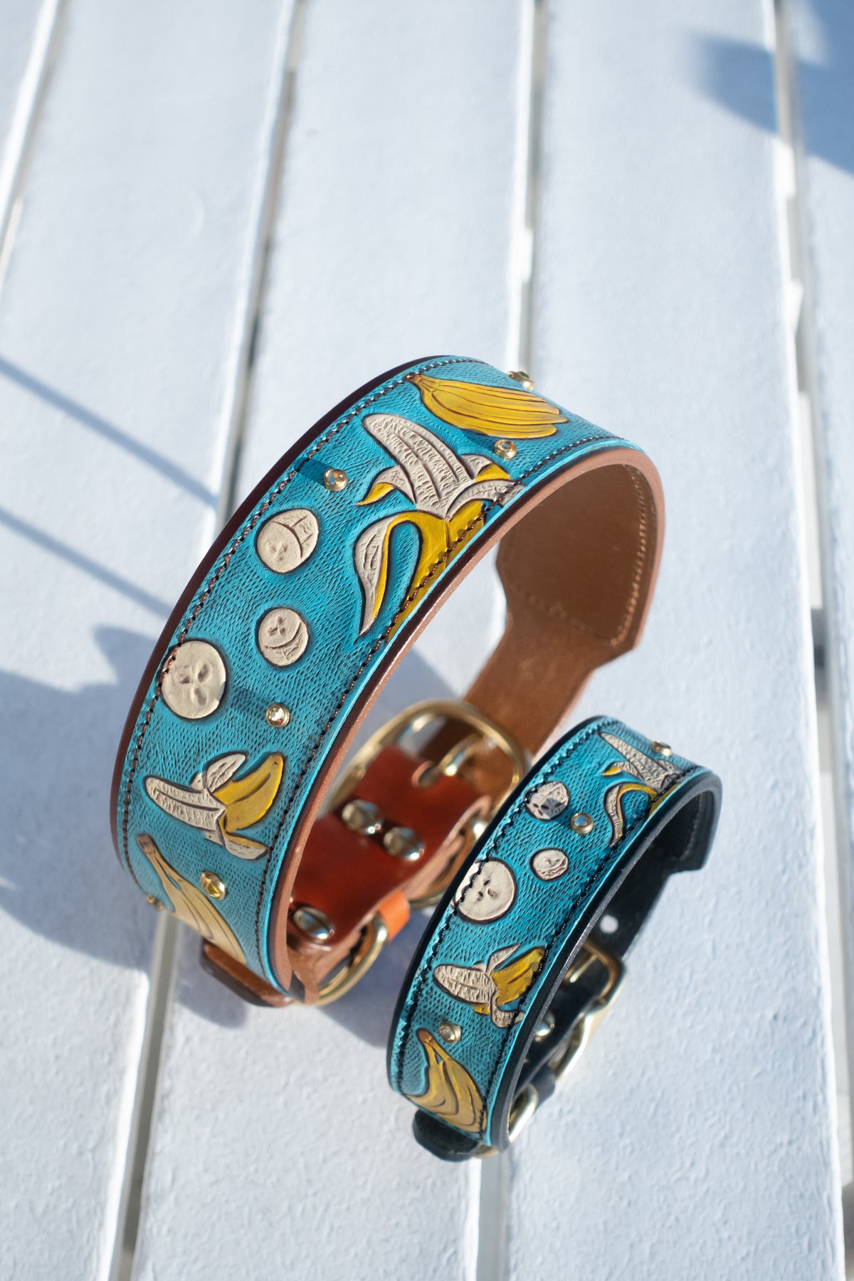 We use solid brass and nickel-plated solid brass hardware for our collars. These center-bar buckles and D-rings are tested for strength and durability. We use chicago screws with Loctite permanent rivet glue to ensure our collars are as durable and strong as they are beautiful. The safety and comfort of your dog is our top priority!