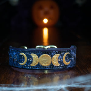 We use solid brass and nickel-plated solid brass hardware for our collars. These center-bar buckles and D-rings are tested for strength and durability. We use chicago screws with Loctite permanent rivet glue to ensure our collars are as durable and strong as they are beautiful. The safety and comfort of your dog is our top priority!