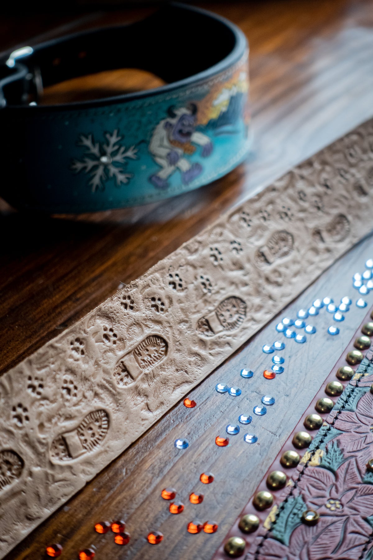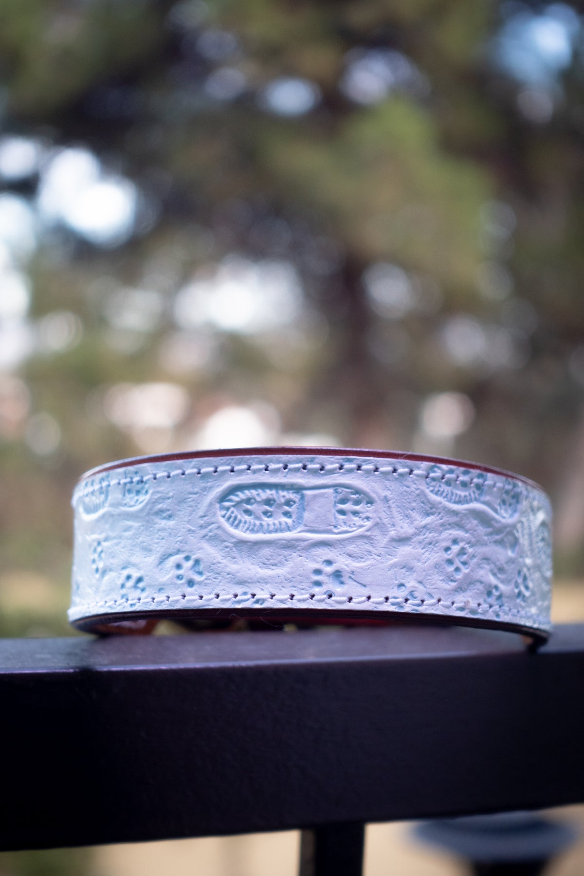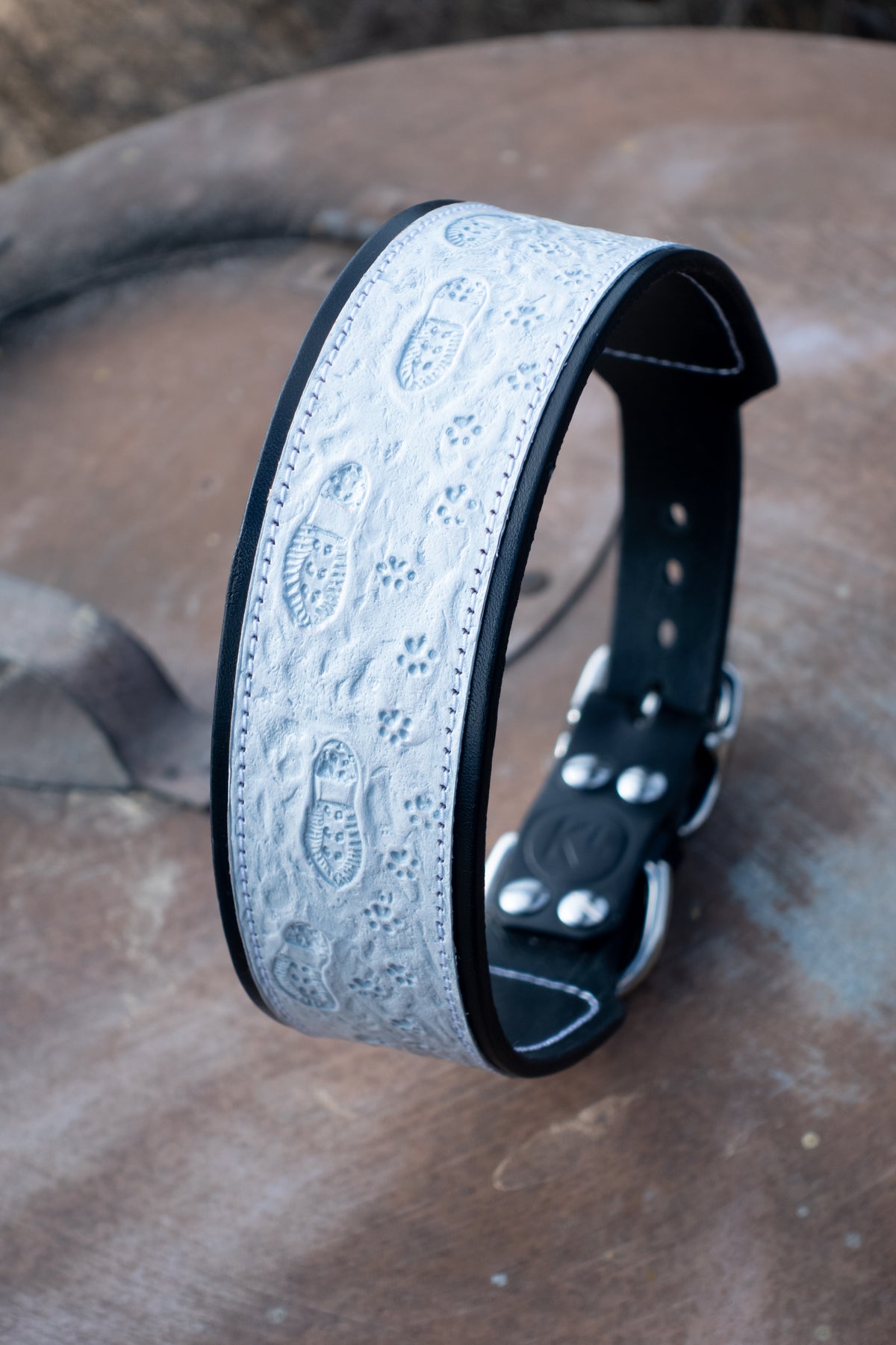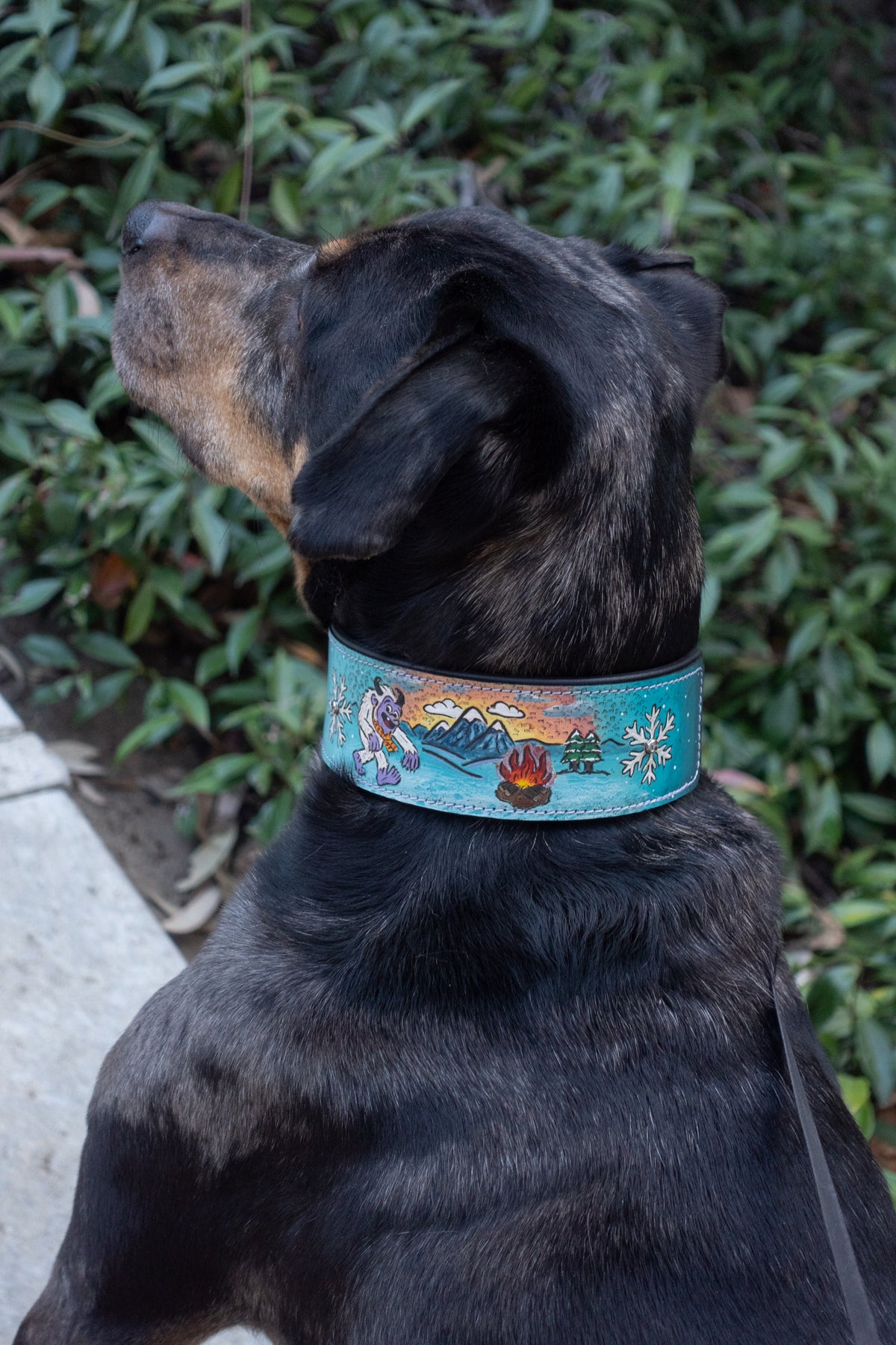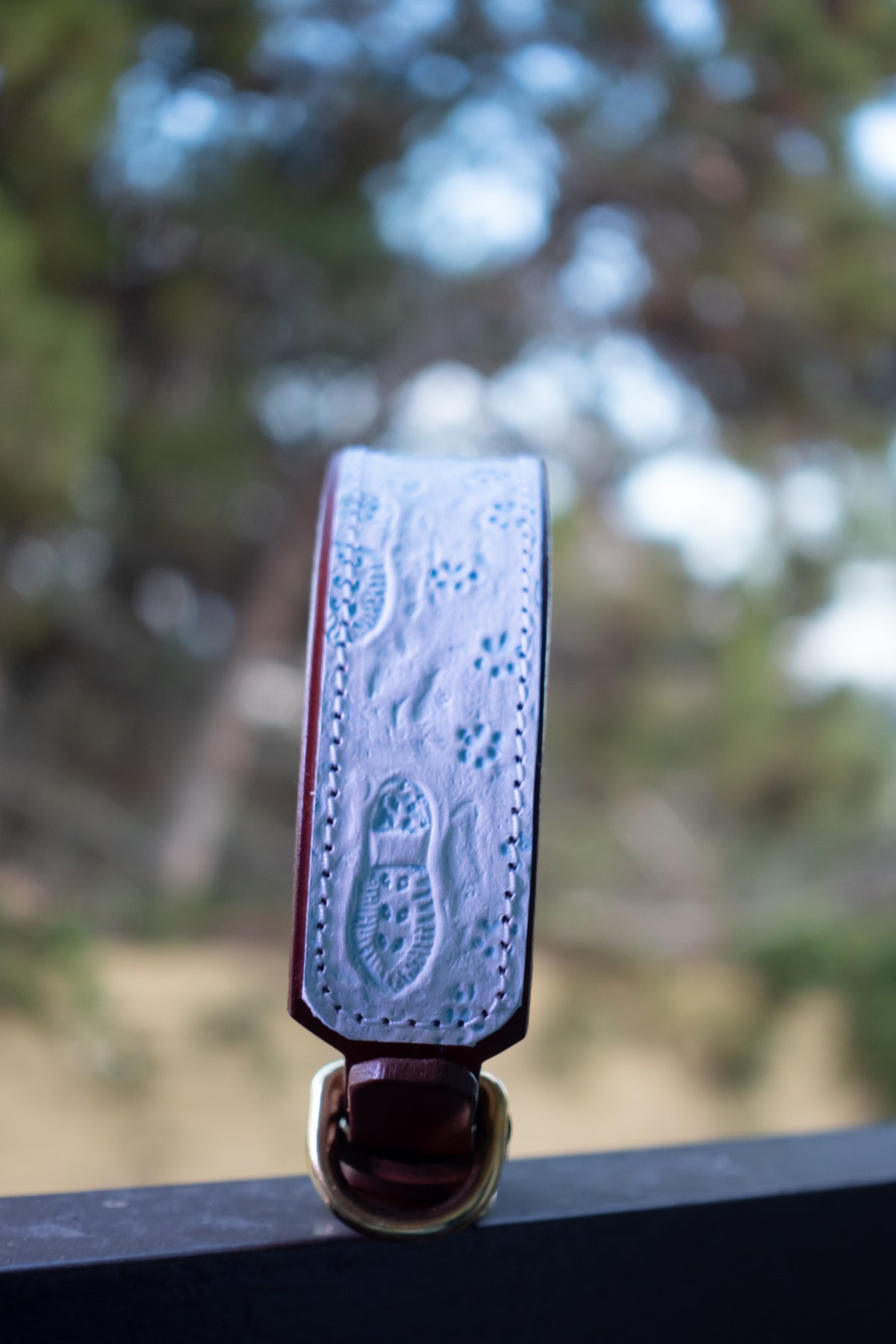 Our original designs are first sketched out on paper before being carved and tooled into the leather using traditional leatherworking techniques. This dog collar is custom-made to order and handcrafted from a hide of leather. We hand paint our designs using Angelus leather paints, formulated for durable use on leather.