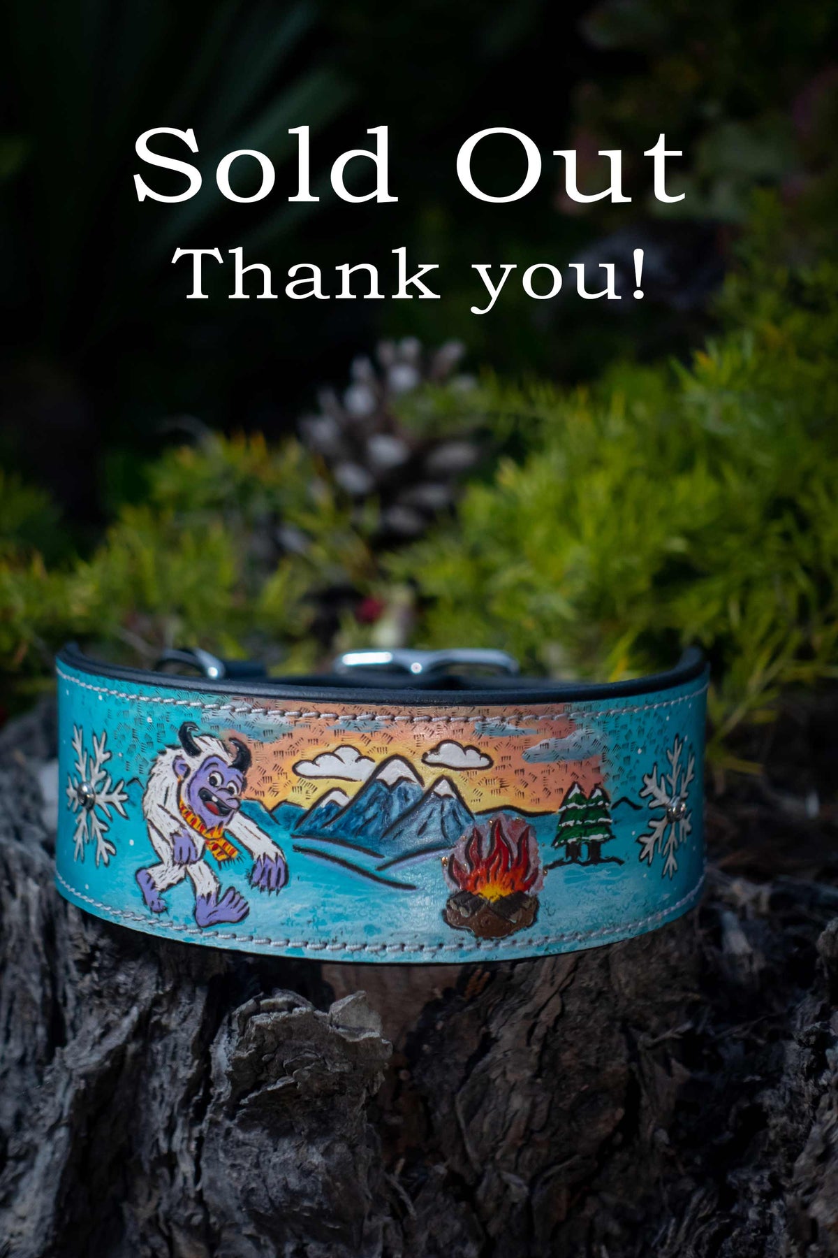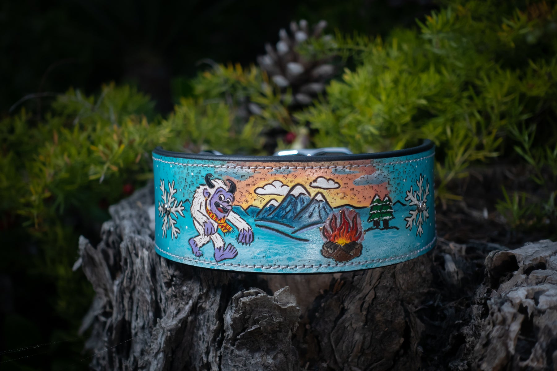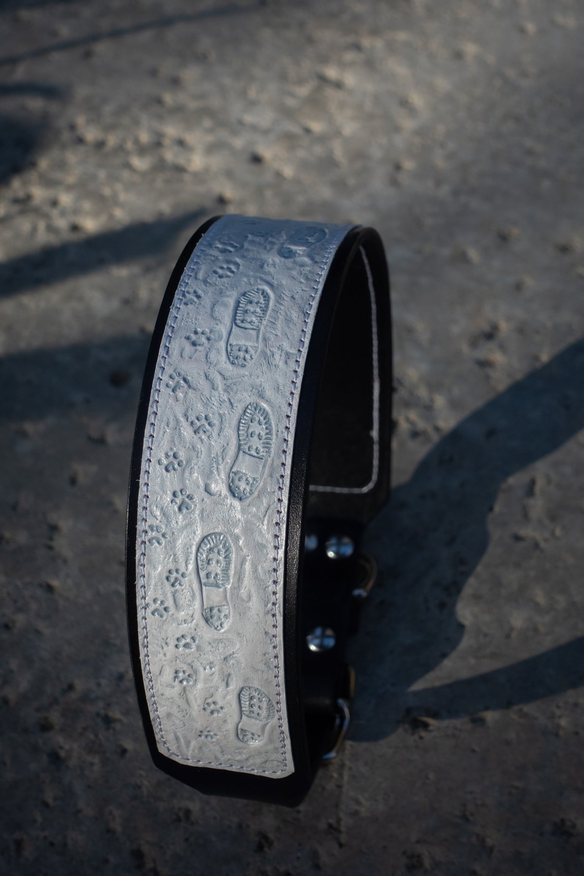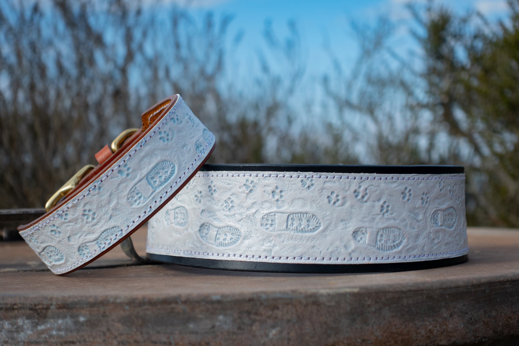 Our original designs are first sketched out on paper before being carved and tooled into the leather using traditional leatherworking techniques. This dog collar is custom-made to order and handcrafted from a hide of leather. We hand paint our designs using Angelus leather paints, formulated for durable use on leather.