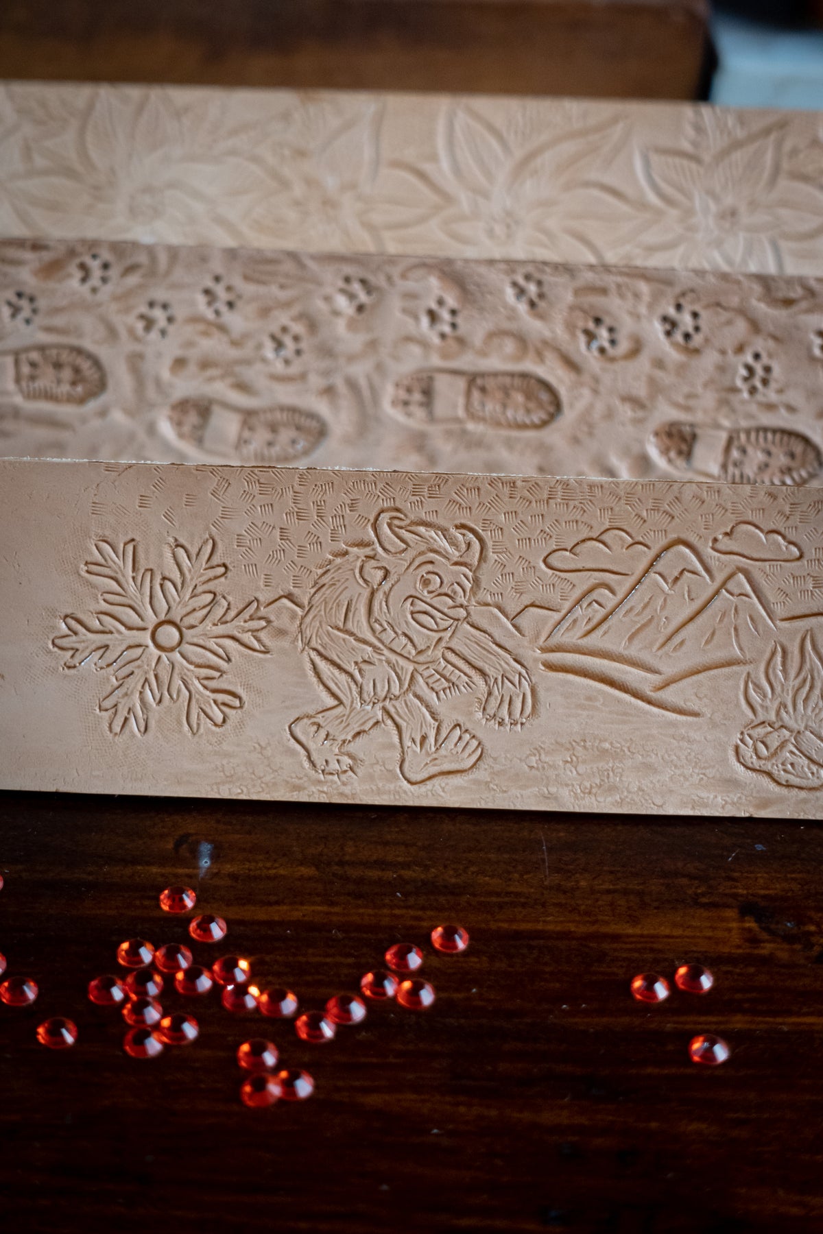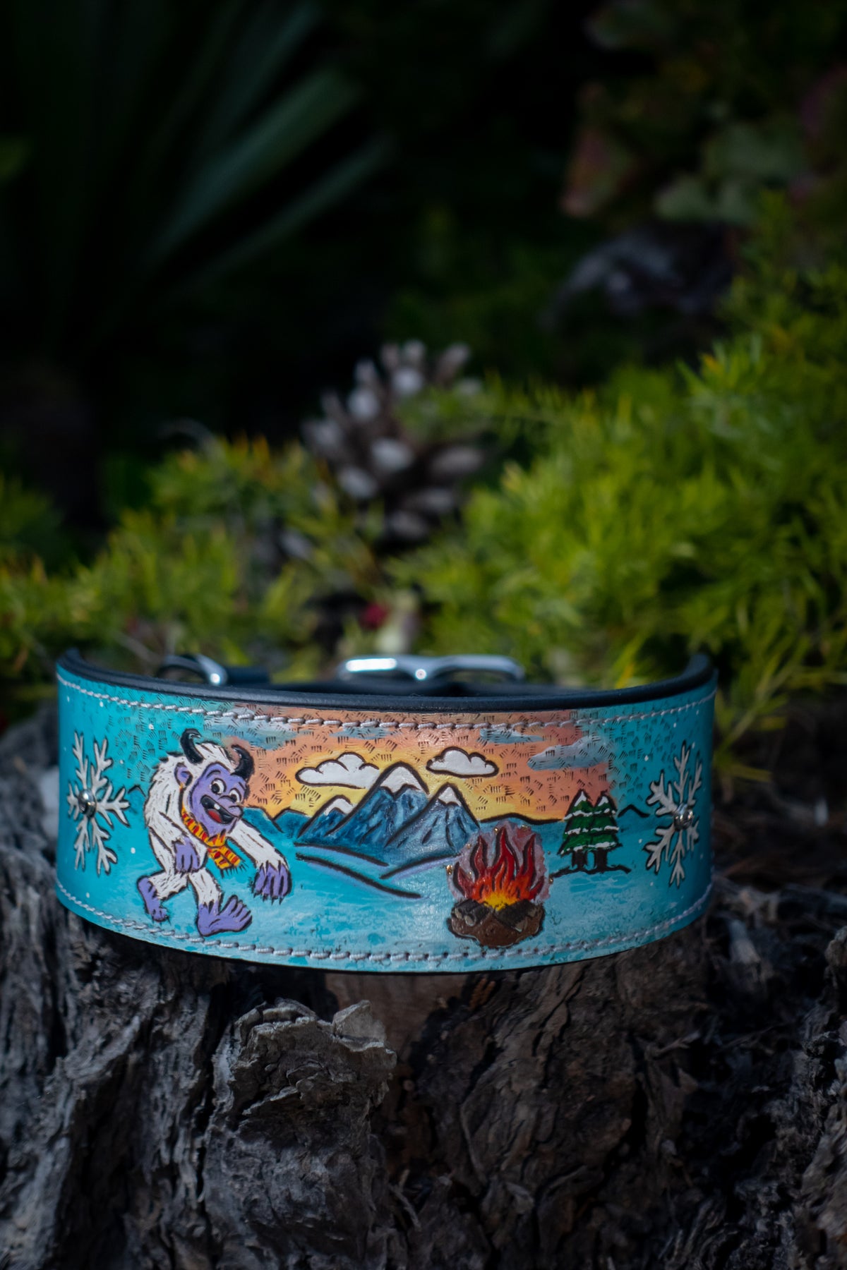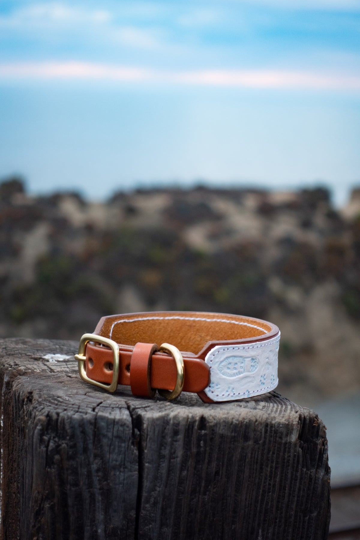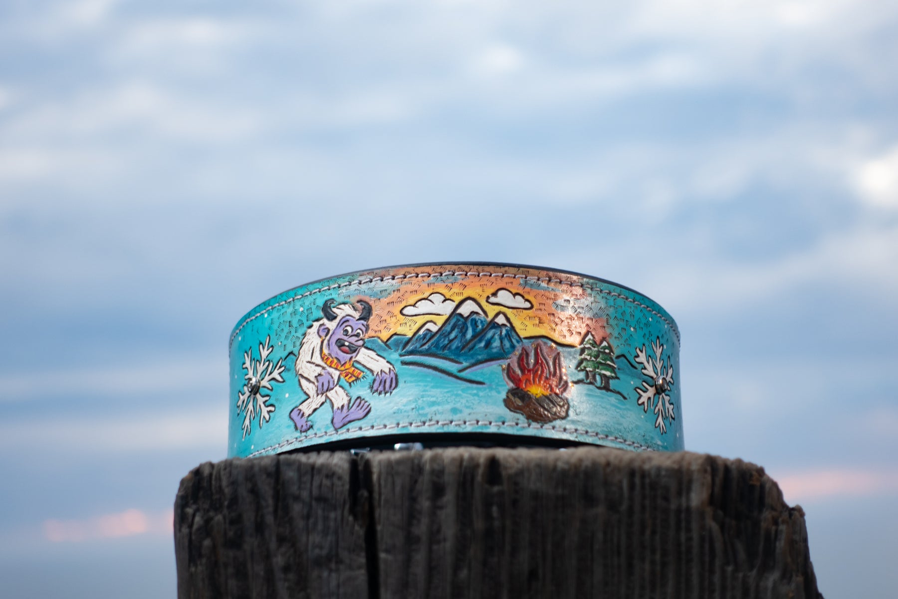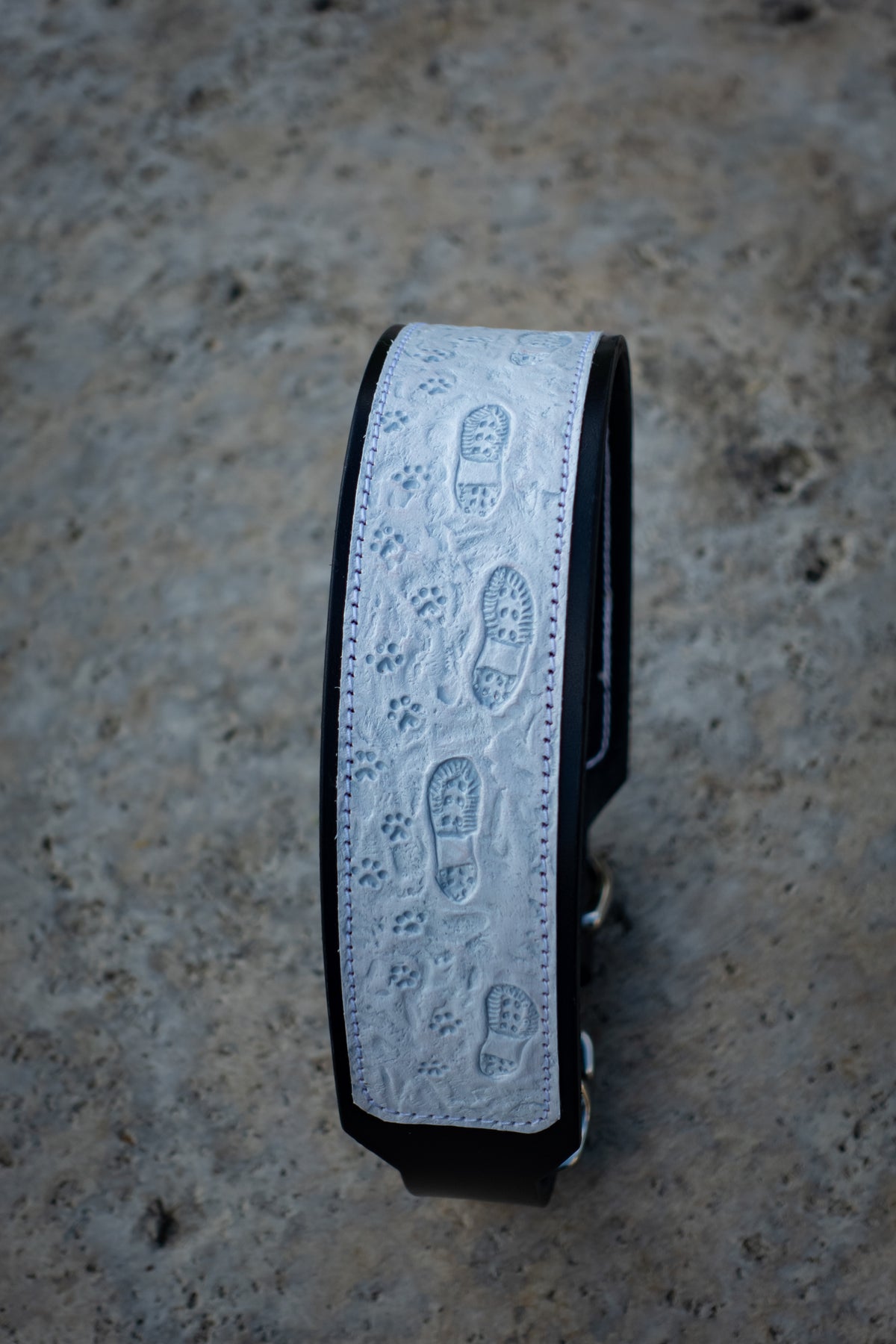 Our original designs are first sketched out on paper before being carved and tooled into the leather using traditional leatherworking techniques. This dog collar is custom-made to order and handcrafted from a hide of leather. We hand paint our designs using Angelus leather paints, formulated for durable use on leather.