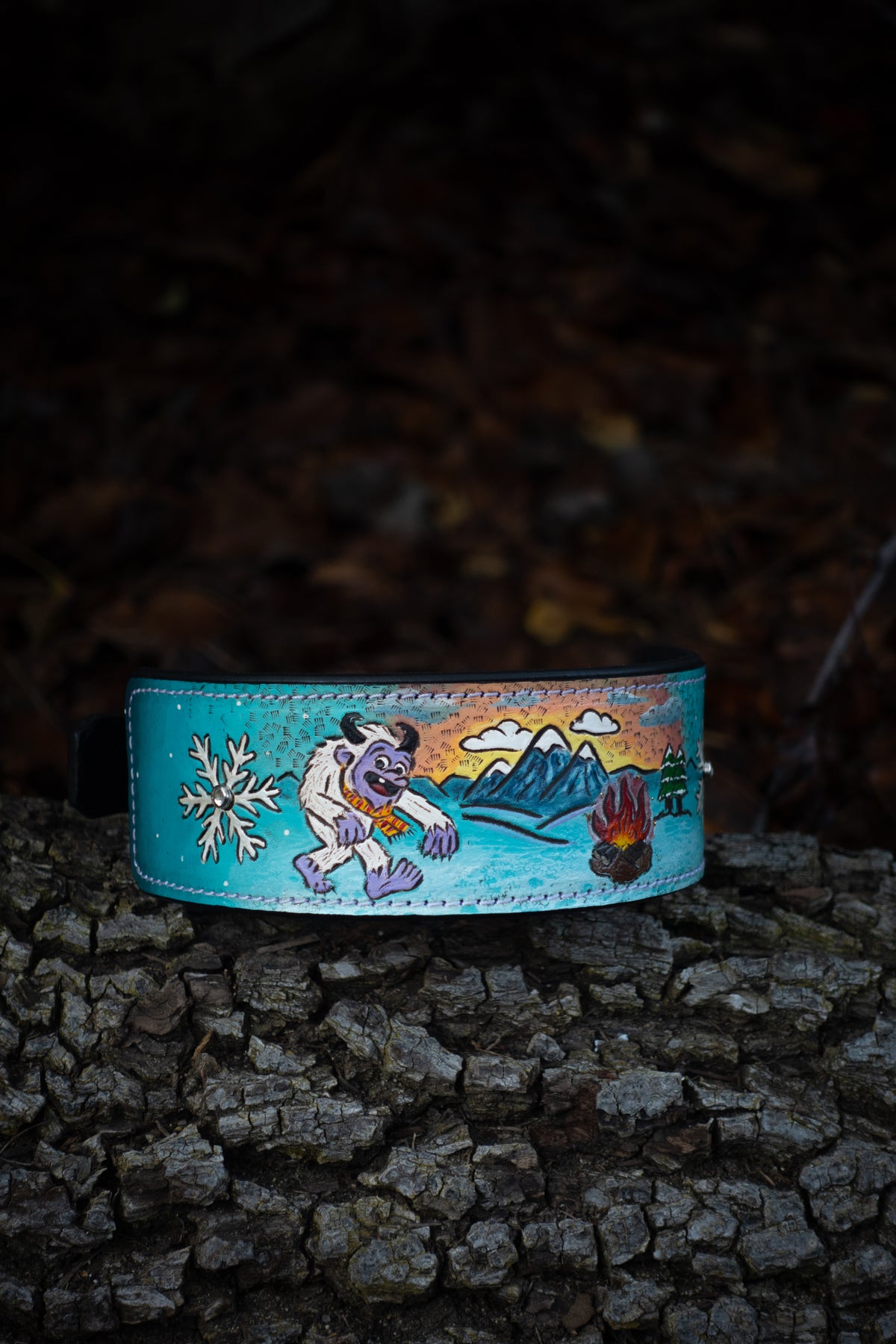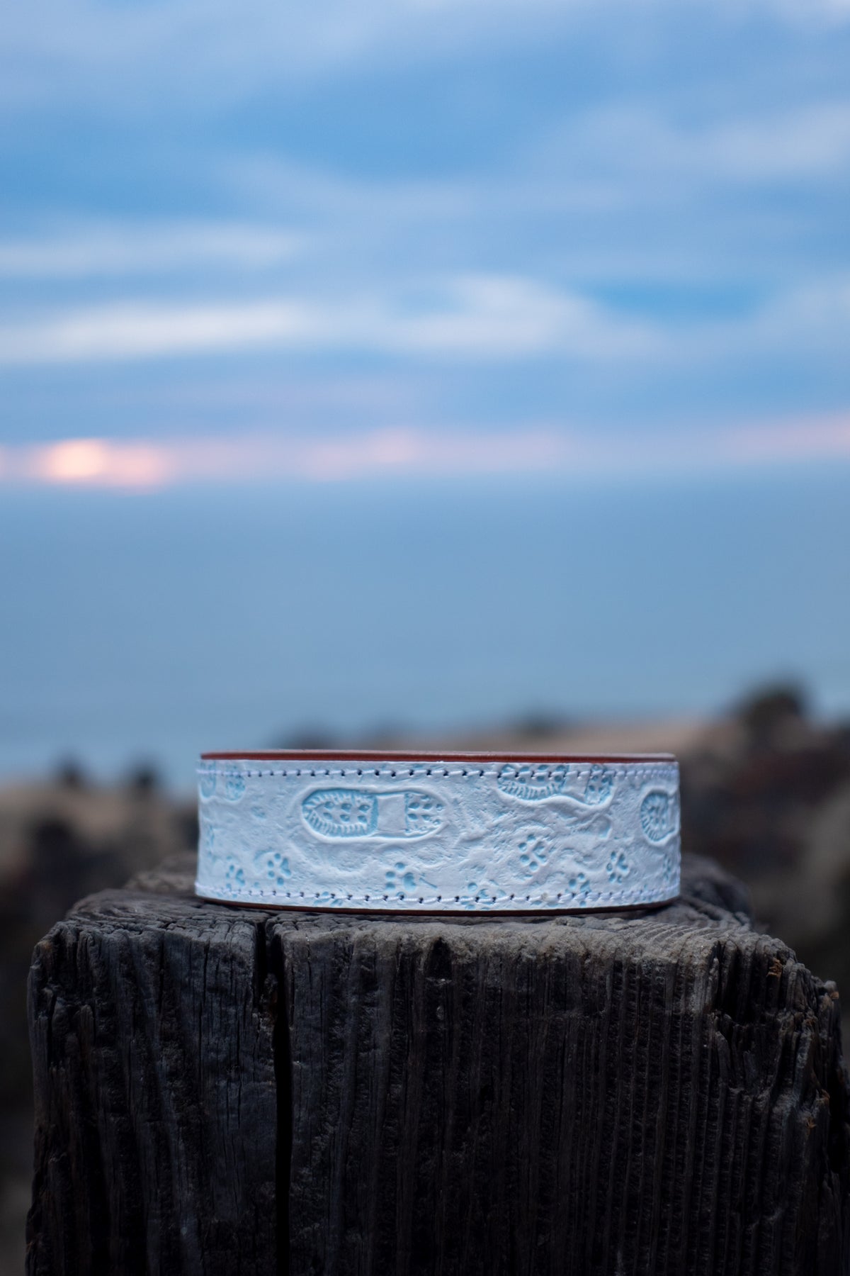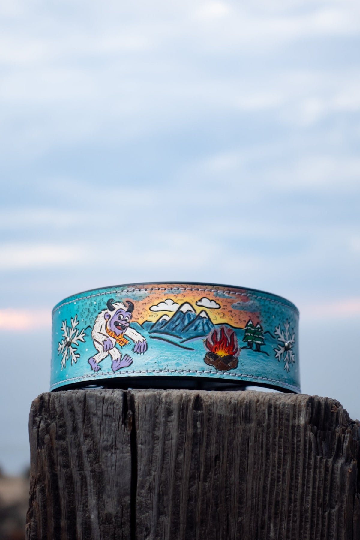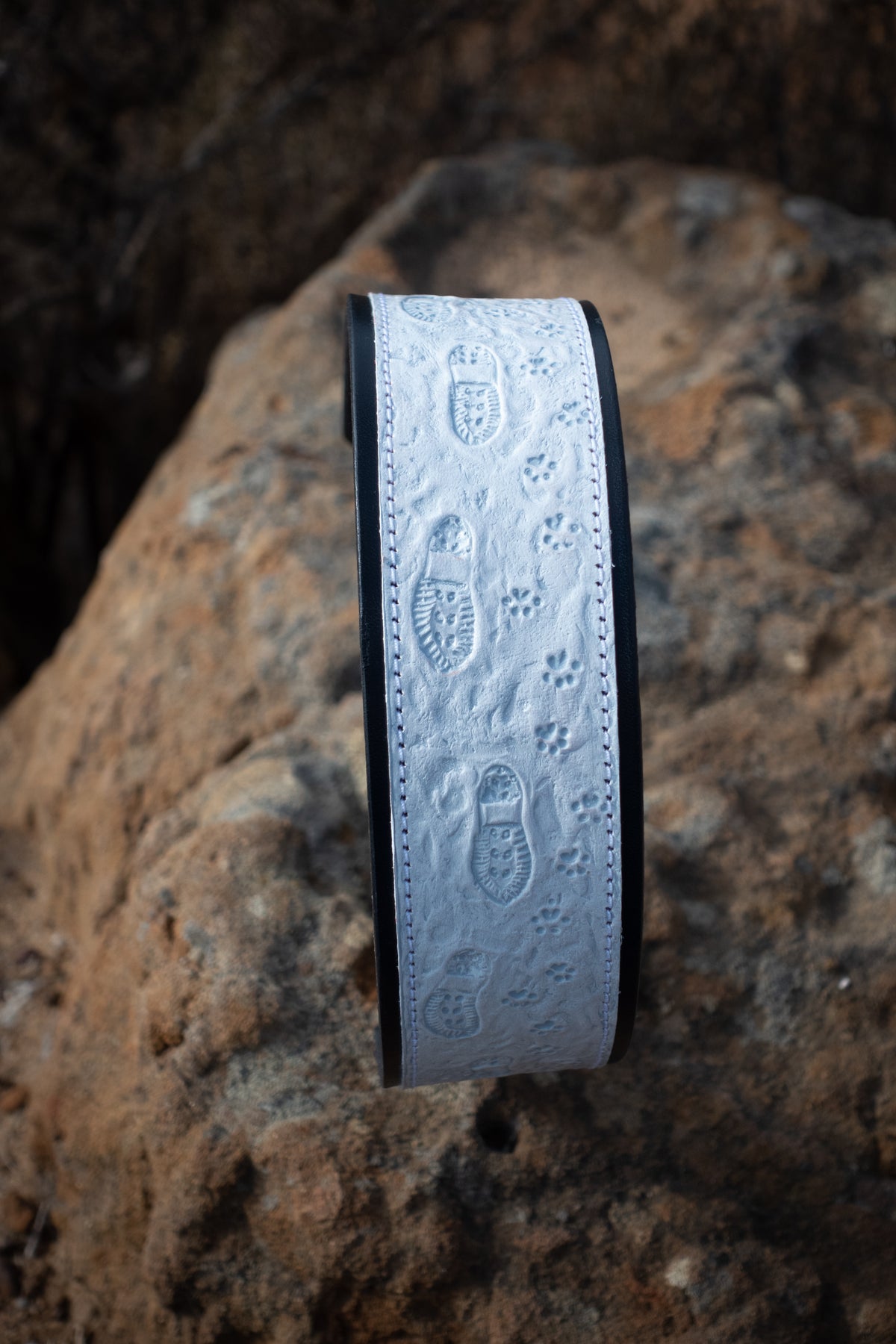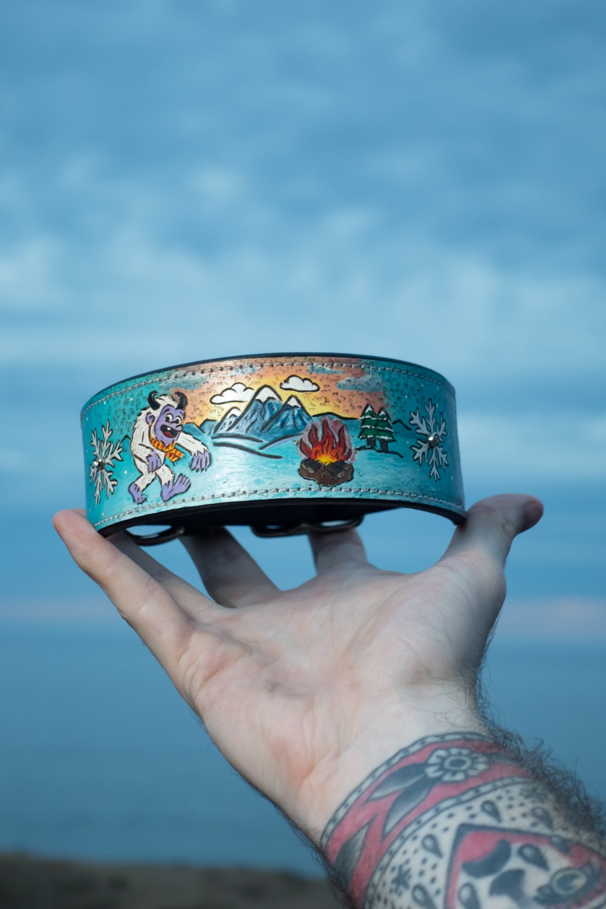 Our original designs are first sketched out on paper before being carved and tooled into the leather using traditional leatherworking techniques. This dog collar is custom-made to order and handcrafted from a hide of leather. We hand paint our designs using Angelus leather paints, formulated for durable use on leather.