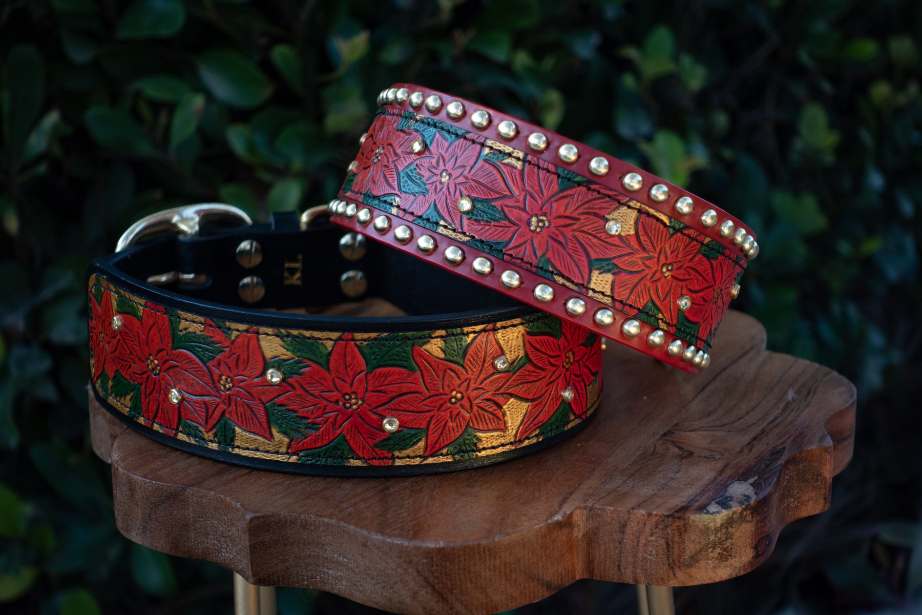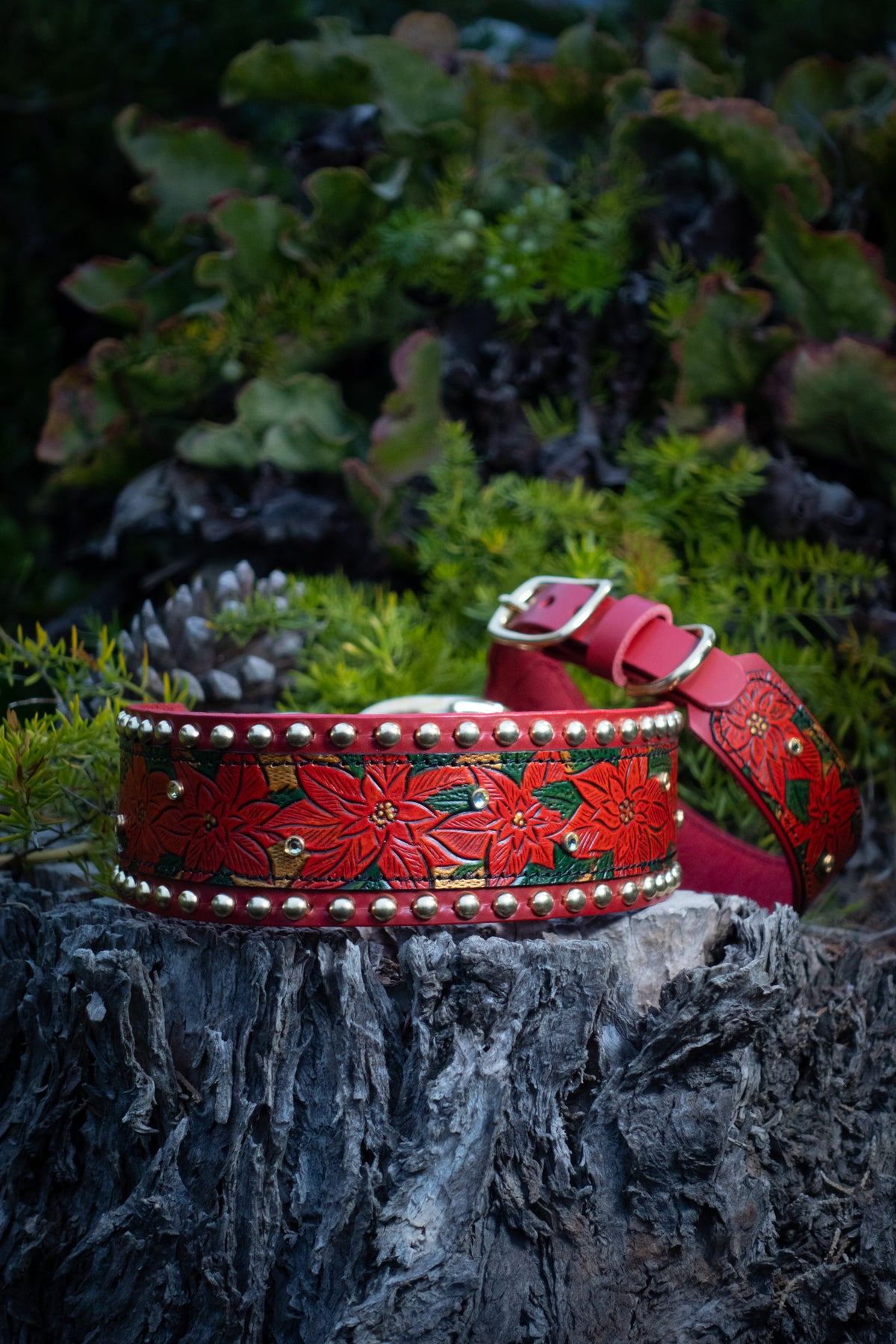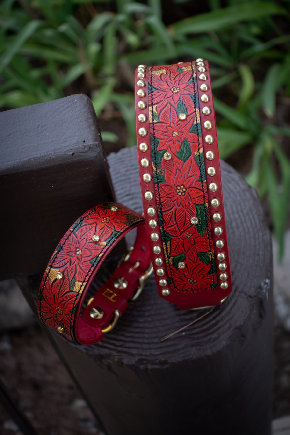 Bring festive cheer to your pup’s wardrobe with this handcrafted Poinsettia Tooled Leather Dog Collar, available for custom order for a limited time. Each collar is tooled, hand-painted, and adorned with shimmering gold accents to capture the magic of the holiday season. The vibrant red poinsettias, evergreen leaves, and detailed craftsmanship make this piece a stunning statement accessory for Christmas photos, winter adventures, and holiday gatherings. Made with premium leather and durable hardware, it’s designed for both beauty and long-lasting wear. Treat your dog to a joyful, one-of-a-kind holiday collar that celebrates the spirit of Christmas in true artisan style.