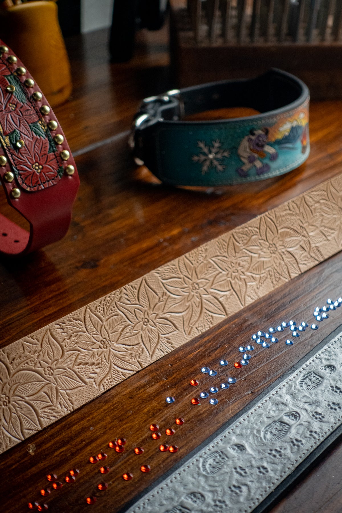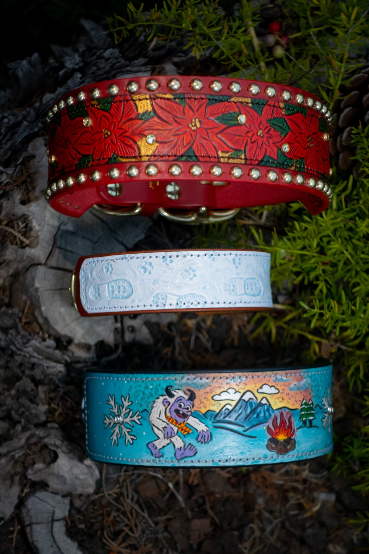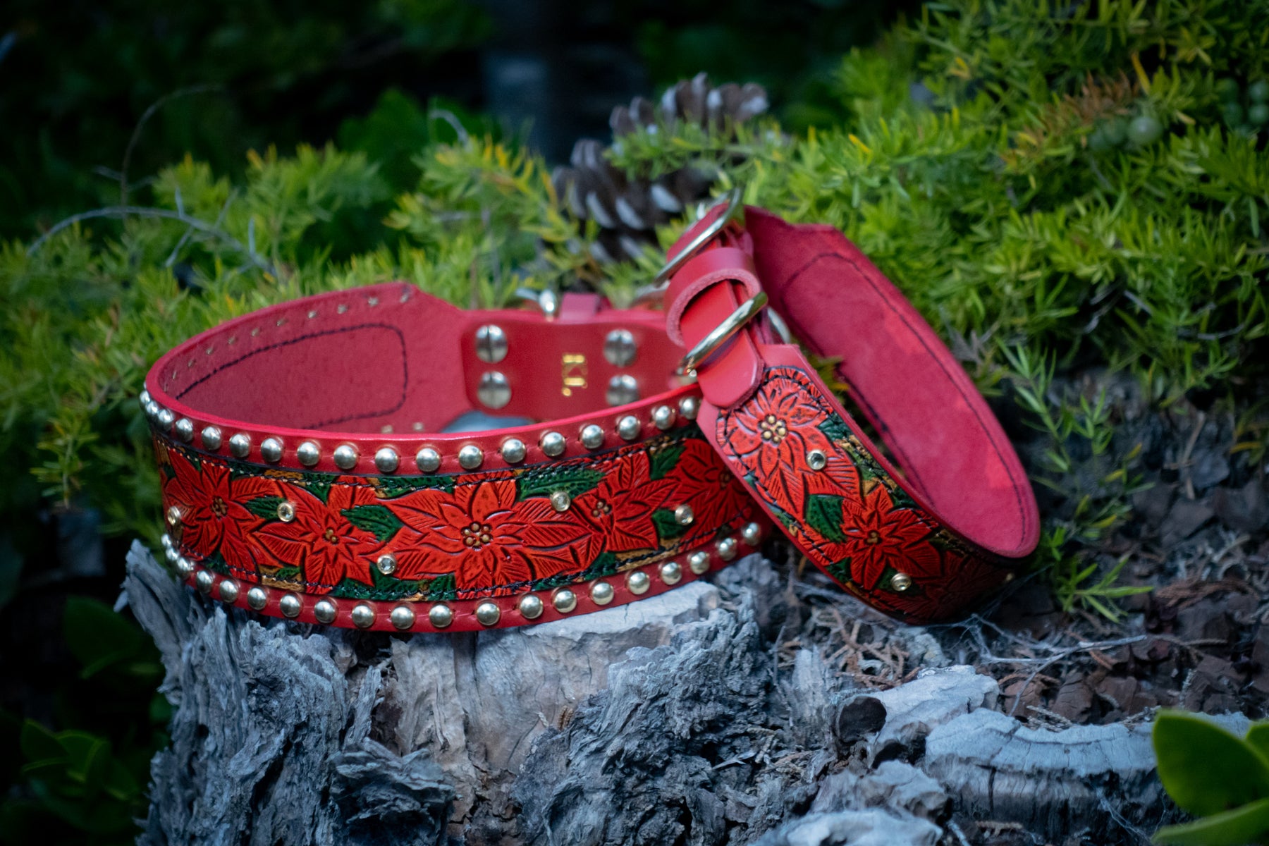 Bring festive cheer to your pup’s wardrobe with this handcrafted Poinsettia Tooled Leather Dog Collar, available for custom order for a limited time. Each collar is tooled, hand-painted, and adorned with shimmering gold accents to capture the magic of the holiday season. The vibrant red poinsettias, evergreen leaves, and detailed craftsmanship make this piece a stunning statement accessory for Christmas photos, winter adventures, and holiday gatherings. Made with premium leather and durable hardware, it’s designed for both beauty and long-lasting wear. Treat your dog to a joyful, one-of-a-kind holiday collar that celebrates the spirit of Christmas in true artisan style.