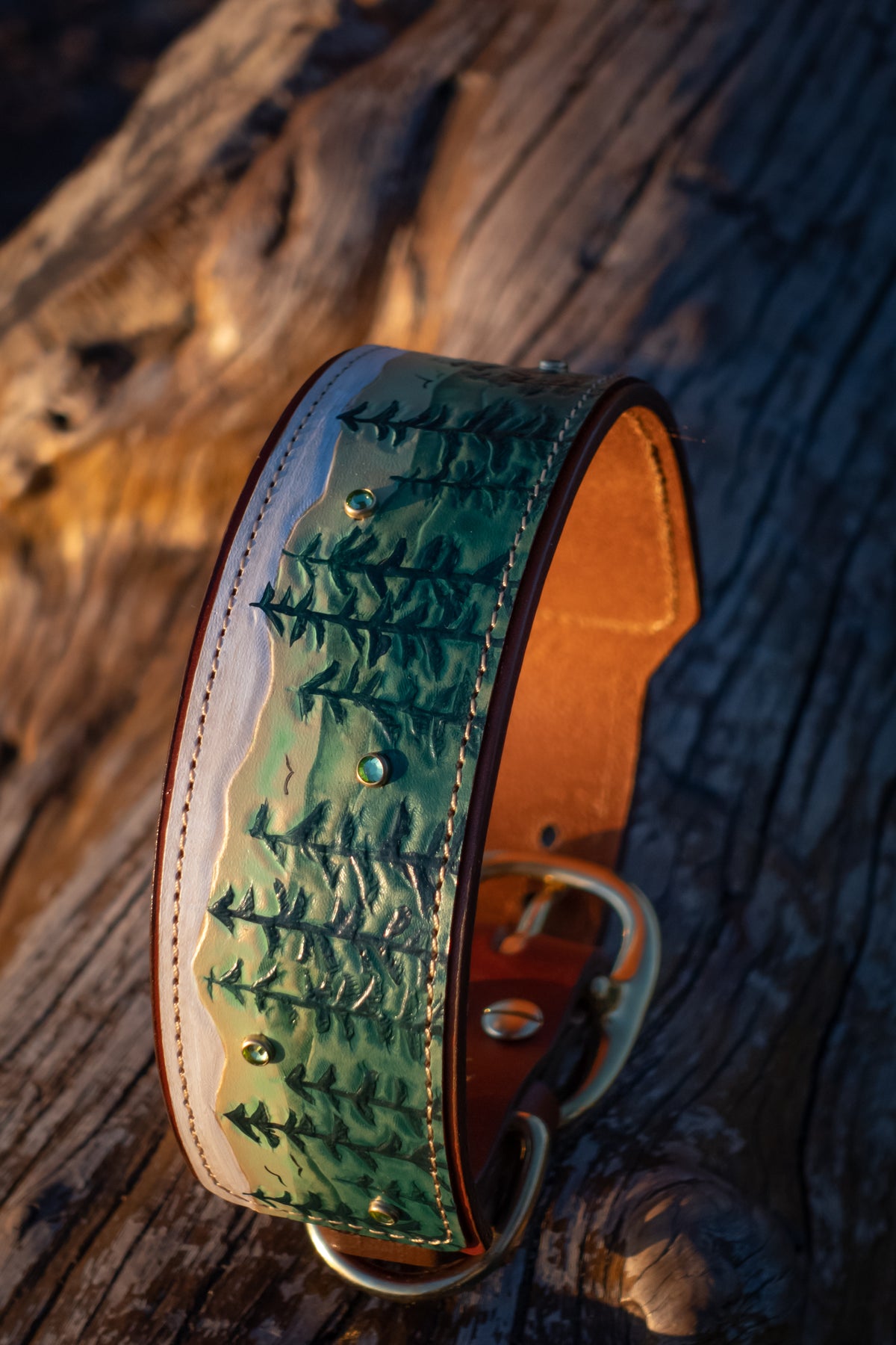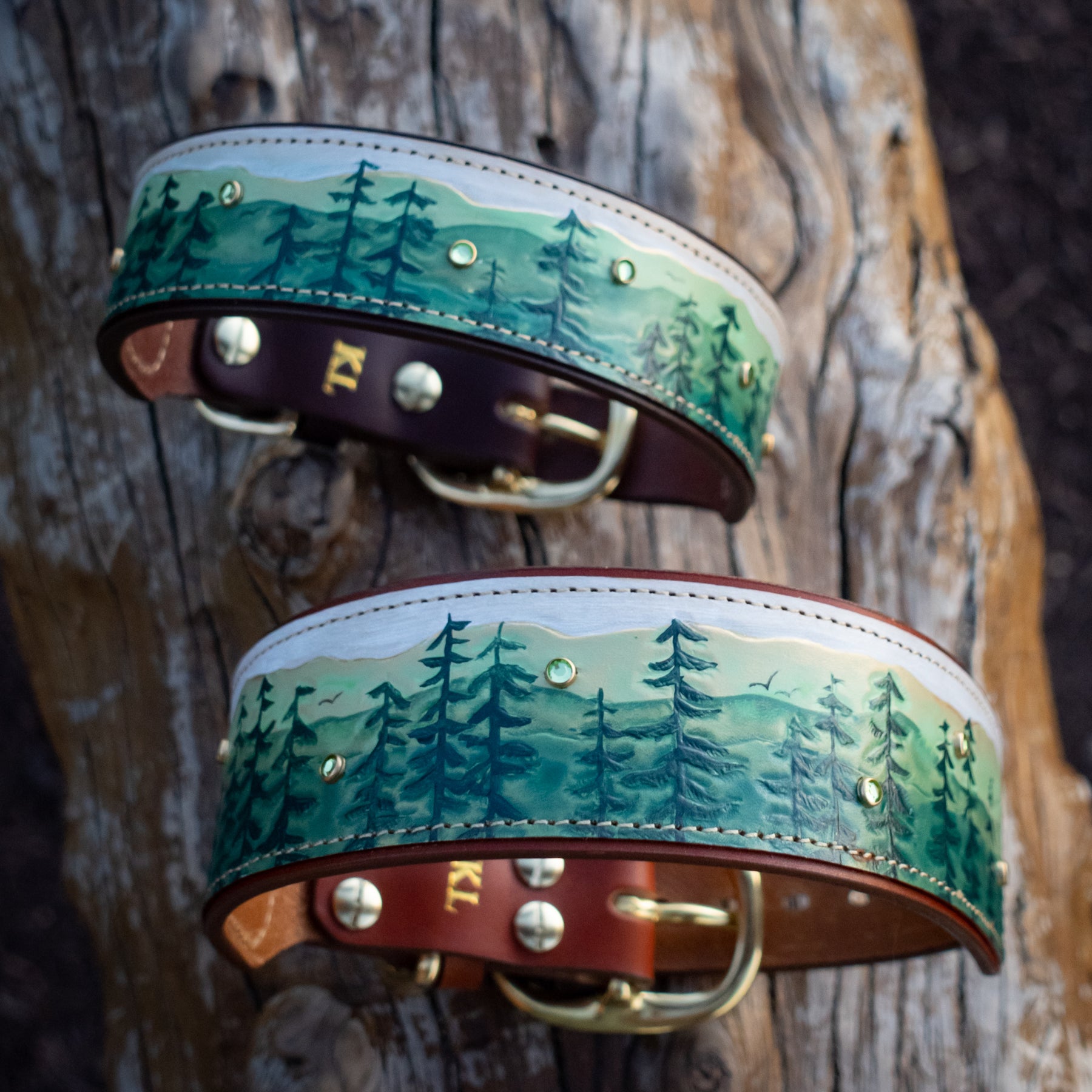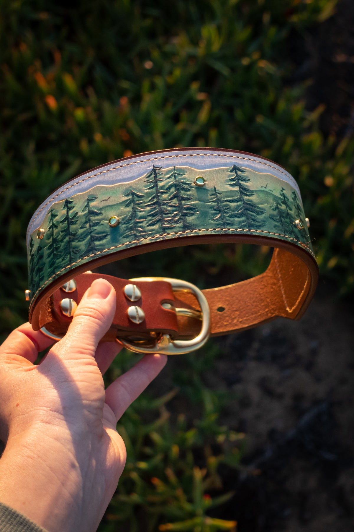 We use solid brass and nickel-plated solid brass hardware for our collars. These center-bar buckles and D-rings are tested for strength and durability. We use chicago screws with Loctite permanent rivet glue to ensure our collars are as durable and strong as they are beautiful. The safety and comfort of your dog is our top priority!
