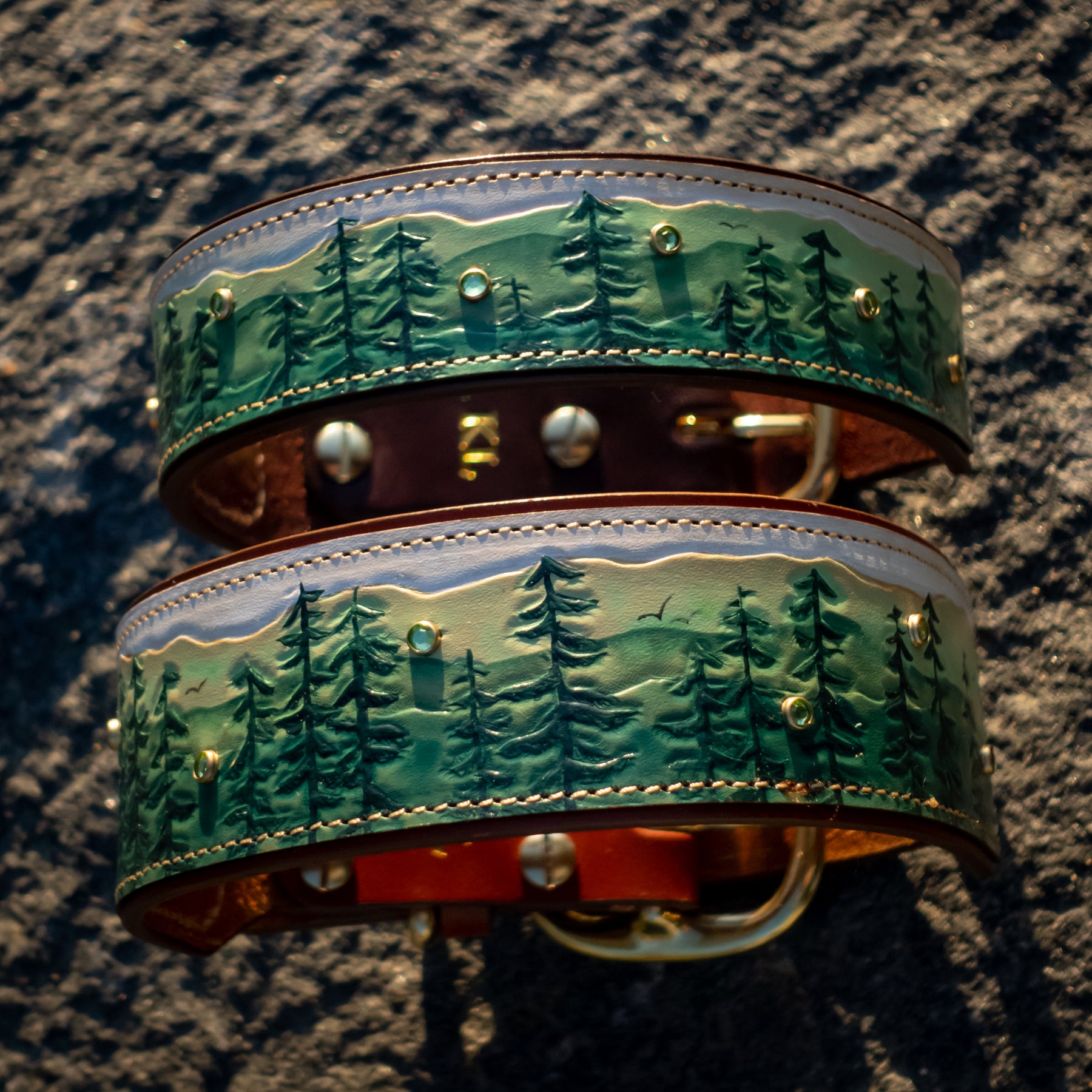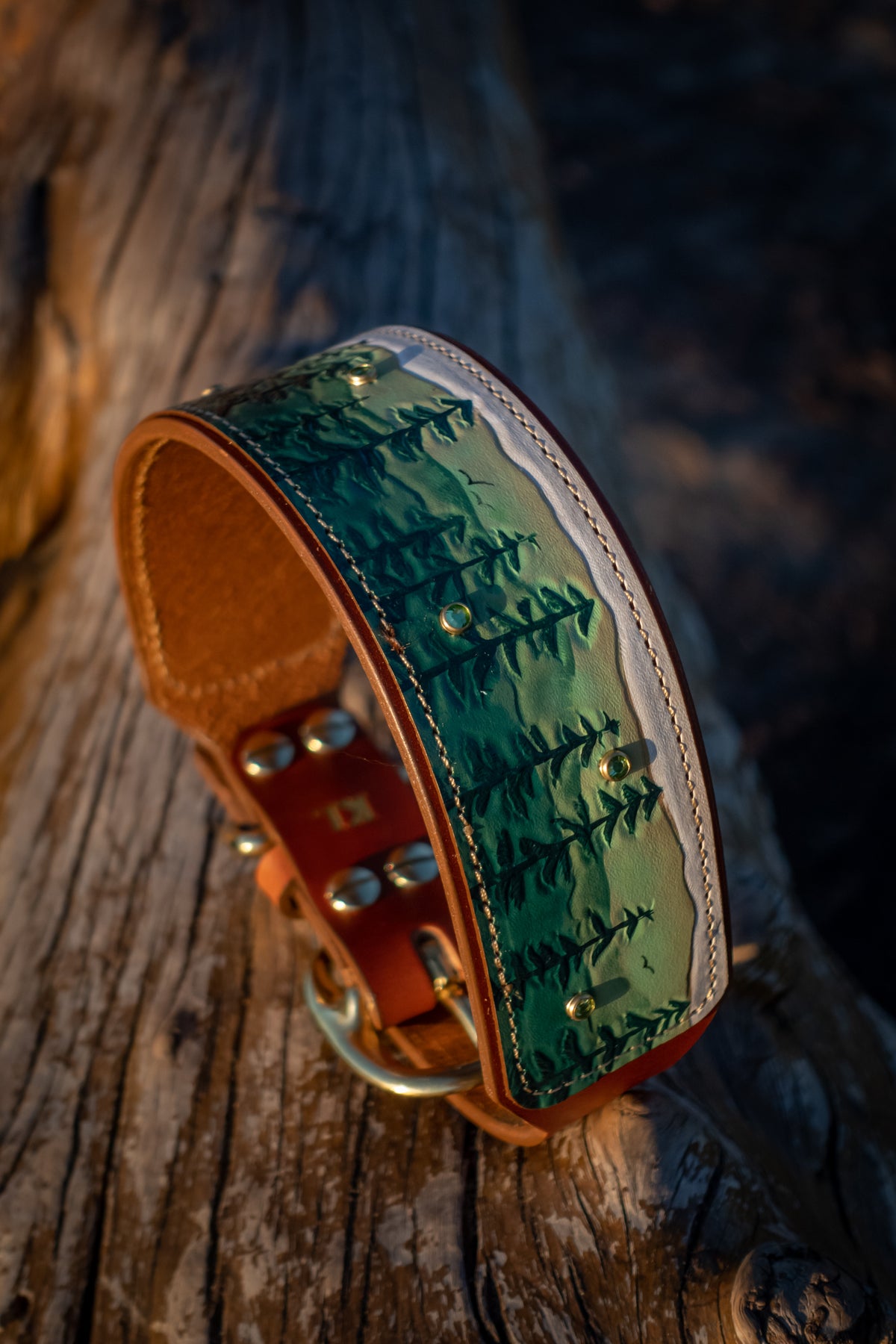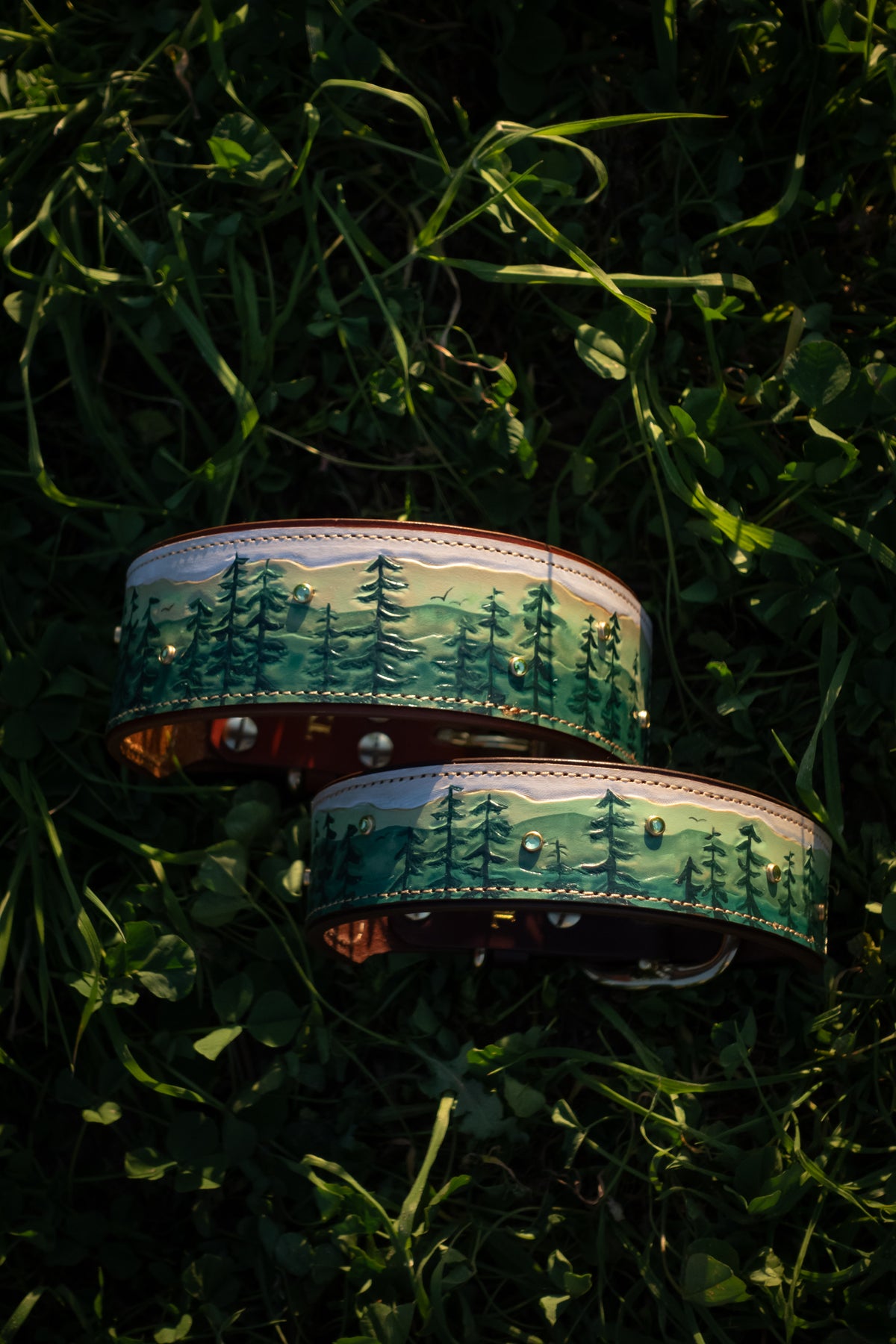 We use solid brass and nickel-plated solid brass hardware for our collars. These center-bar buckles and D-rings are tested for strength and durability. We use chicago screws with Loctite permanent rivet glue to ensure our collars are as durable and strong as they are beautiful. The safety and comfort of your dog is our top priority!